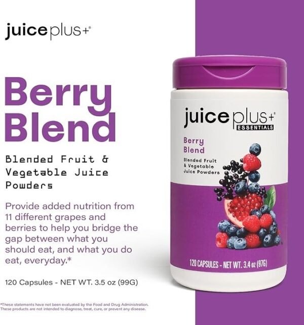 JuicePlus+ Berry Blend Capsules deliver concentrated nutrition from antioxidant-rich berries like blueberry, cranberry, pomegranate, and elderberry. This whole-food formula supports heart health, immunity, brain function, and healthy skin while helping protect against oxidative stress. Free from artificial colors, flavors, and preservatives. Bundle of 10 products for convenient daily nutrition